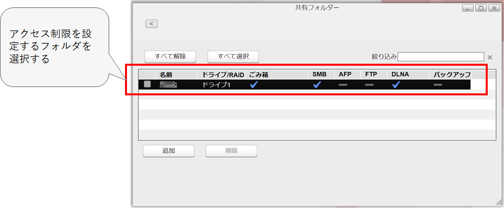 NASにアクセス制限が未設定の場合は「環境設定」から「共有フォルダ」を選択してアクセス制限を設定します。