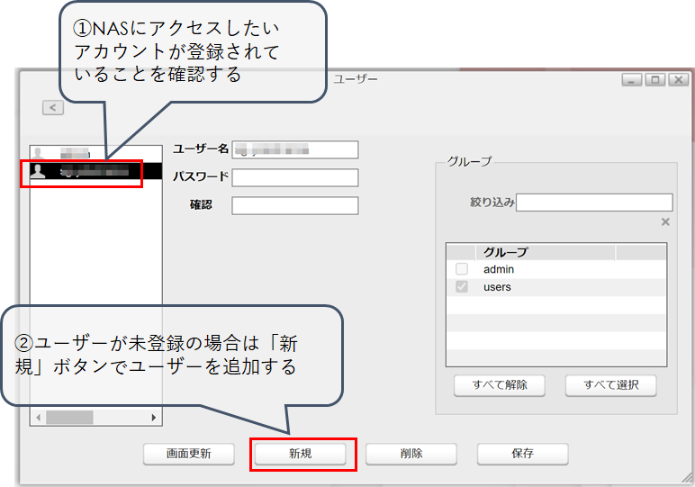 ユーザー情報にNASへアクセスしたいユーザーが登録されていることを確認します。